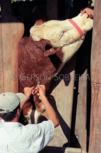 Keywords: Vertical, Corpo, Cabeça, Animal, Gado Pecuaria, Bovino, Vaca, Simental, Suiço, Gente, Homem, Rapaz, Trabalho, Vaqueiro Peao Cowboy, Manejo, Exame, Colheita, Coleta sangue, Seringa, Instalaçao, Brete, Ubirajara, Sao Paulo |