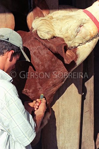 Keywords: Squeeze chute, Construction, Syringe, Harvest, Blood collect, Examination, Handling, Cowpoke Buckaroo Cowboy, Job, Man, Young man, People, Swiss, Simmental, Cow, Cattle Livestock, Bovine, Animal, Head, Body, Vertical, Ubirajara, Sao Paulo |