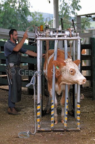 Keywords: Animal, Immobilized, Confined, Moveable squeeze chute, Veterinarian, Job, Man, Adult, People, Squeeze chute, Corral, Construction, Machine, Equipment, Fleckvieh, Simmental, Heifer, Cattle Livestock, Bovine, Candido de Abreu, Parana |