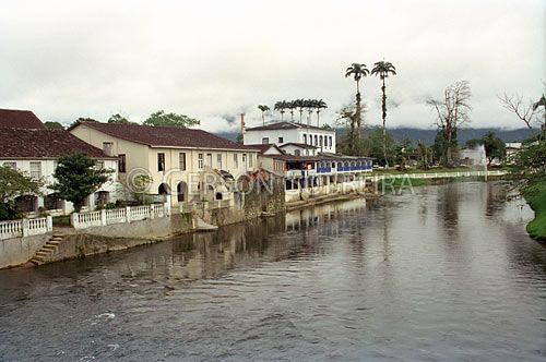 Keywords: Horizontal, Arquitetura, Predio, Edificio, Urbano, Patrimonio historico, Casario, Parana, Morretes, Paisagem, Agua, Rio, Riacho, Rio Nhundiaquara, Roystonea oleracea, Palmeira, Arecaceae, Imperial |