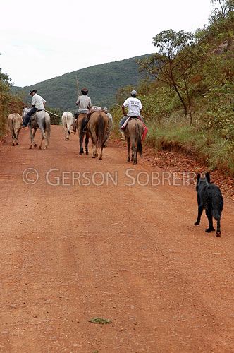 Keywords: Landscape, Nature, Earth road, Road, Transport, Estrada Real, Conceiçao do Mato Dentro, Minas Gerais, Dog, Domestic animal, Roundup, Handling, Horse, Equine, Ox, Cattle Livestock, Bovine, Animal, Field, Rural, People, Group, Inlander, Job, Cowpoke Buckaroo Cowboy, 2005 |