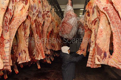 Keywords: Cooling, Stock, Cold, Refrigerator room, Carcass, Animal, Cattle Livestock, Bovine, Igarape do Meio, Maranhao, Industry, Slaughterhouse, People, Man, Adult, Cut, Meat, 2007 |