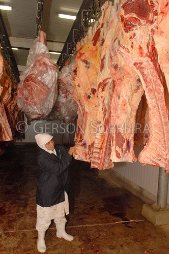 Keywords: Vertical, Cooling, Stock, Cold, Refrigerator room, Carcass, Animal, Cattle Livestock, Bovine, Igarape do Meio, Maranhao, Industry, Slaughterhouse, People, Man, Adult, Cut, Meat, 2007 |