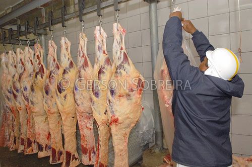 Keywords: Meat, Cut, Man, Adult, People, Slaughterhouse, Industry, Maranhao, Igarape do Meio, Cattle Livestock, Bovine, Animal, Carcass, Refrigerator room, Cold, Stock, Cooling, Horizontal, 2007 |