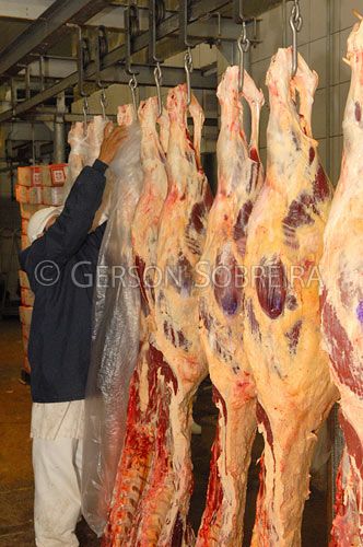 Keywords: Meat, Cut, Man, Adult, People, Slaughterhouse, Industry, Maranhao, Igarape do Meio, Cattle Livestock, Bovine, Animal, Carcass, Refrigerator room, Cold, Stock, Cooling, 2007 |