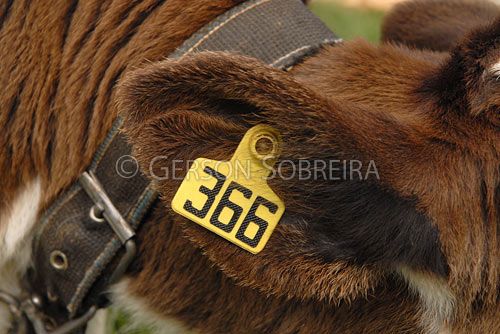 Keywords: Horizontal, Handling, Cattle Livestock, Bovine, Animal, 2007, Rio Grande do Sul, Palmeira das Missoes, Holstein Friesian, Holstein, Dutch, Heifer calf, Object, Signaling signalling, Ear tag, Identification, Collar, Detail, Ear |