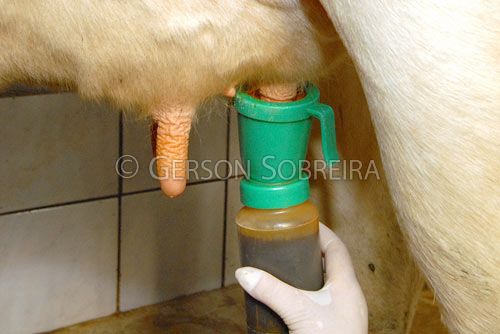 Keywords: Woman, Adult, Horizontal, Udder, Teat nipple, Frederico Westphalen, Cow, Cattle Livestock, Bovine, Animal, 2007, Rio Grande do Sul, Holstein Friesian, Holstein, Dutch, People, Job, Dairy worker, Handling, Milk, Pos Dipping Pos-dipping, Disinfection, Disinfectant, Hand, Glove |