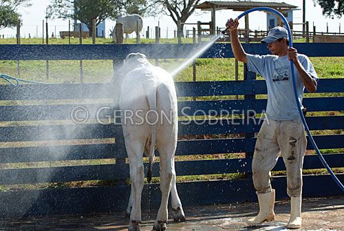Keywords: Vaqueiro Peao Cowboy, Trabalho, Homem, Adulto, Gente, Vaca, Sao Paulo, Padrao, Nelore, Gado Pecuaria, Bovino, Animal, Itapetininga, 2010, Horizontal, Banhando, Banho, Lavagem, Lavando, Agua, Curral, Mangueira |