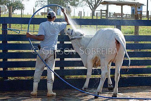 Keywords: Vaqueiro Peao Cowboy, Trabalho, Homem, Adulto, Gente, Vaca, Sao Paulo, Padrao, Nelore, Gado Pecuaria, Bovino, Animal, Itapetininga, 2010, Horizontal, Banhando, Banho, Lavagem, Lavando, Agua, Curral, Mangueira |