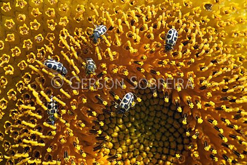 Keywords: Capitulo, Praga, Inseto, Fauna, Animal, Helianthus annuus, Girassol, Oleaginosa, Agricultura Agricola, Sao Luiz Gonzaga, Rio Grande do Sul, 2010, Detalhe, Macro, Horizontal, Besouro, Vaquinha-amarela, Astylus variegatus, Flor |
