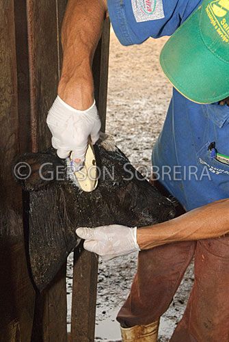Keywords: Luva, Retireiro, Trabalho, Homem, Adulto, Gente, Animal, Gado Pecuaria, Bovino, 2010, Minas Gerais, Uberlandia, Leiteira, Leiteiro, Girolando, Bezerra, Vertical, Manejo, Limpeza, Assepsia, Tratamento, Curativo, Doença, Inflamaçao, Descornado, Imobilizado, Instalaçao rural, Tronco, Brete, Sabao, Escova |
