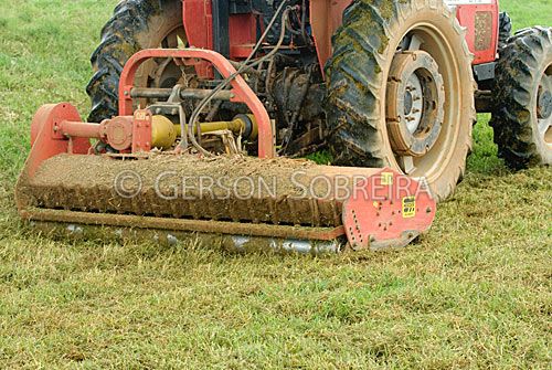 Keywords: Cleared land, Line trimmer, Tractor, Equipment, Pasturage, Pasture, Agriculture, Cynodon dactylon, Tifton, Grass, Minas Gerais, Sao Gotardo, 2010, Horizontal |
