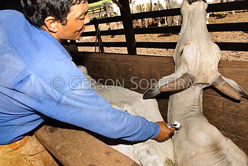 Keywords: Gado Pecuaria, Bovino, Nelore, Animal, Vacinando, Aftosa, Homem, Adulto, Vaqueiro Peao Cowboy, Trabalho, Gente, 2011, Parana, Santa Fe, Curral, Manejo, Vacinaçao, Vacina, Seringa, Pistola, Dosadora, Horizontal |