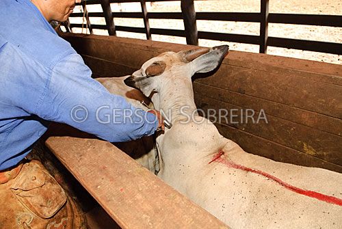 Keywords: Gado Pecuaria, Bovino, Nelore, Animal, Vacinando, Aftosa, Homem, Adulto, Vaqueiro Peao Cowboy, Trabalho, Gente, 2011, Parana, Santa Fe, Curral, Manejo, Vacinaçao, Vacina, Seringa, Pistola, Dosadora, Horizontal |