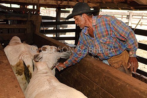 Keywords: Gado Pecuaria, Bovino, Nelore, Animal, Horizontal, Vacinando, Carbunculo, Homem, Adulto, Vaqueiro Peao Cowboy, Trabalho, Gente, 2011, Parana, Santa Fe, Curral, Manejo, Vacinaçao, Vacina, Seringa, Pistola, Dosadora |