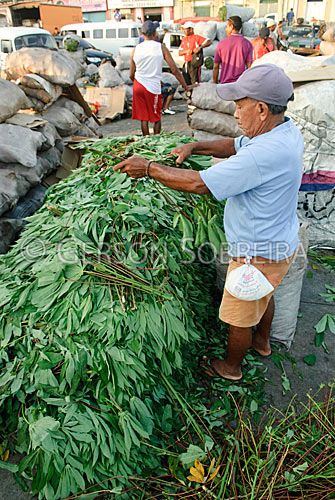 Keywords: Praça, Folha, Homem, Adulto, Gente, Maniçoba, Manihot esculenta, Mandioca-brava, Maniva, Mandioca, Tuberculo, Mercado Ver-o-Peso, 2011, Belem, Para, Comercio, Venda, Feira, Vertical, Desfolha, Desfolhando, Pilha, Empilhado |