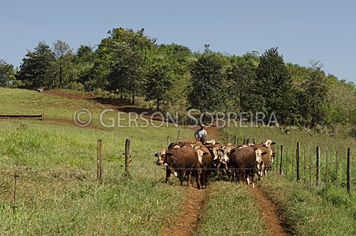 Keywords: Man, Adult, Cowpoke Buckaroo Cowboy, Job, People, Horse, Drive, Driving, Roundup, Bull group, Young bull, Bull, Male, Braford, Cattle Livestock, Bovine, Animal, Parana, Londrina, Horizontal, 2011, Rural installation, Fence, Eletric |