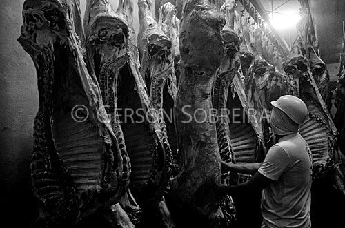 Keywords: Preto e Branco, Frigorifico, Braford, Imunocastrado, Castrado, Macho, Gordo, Boi, Animal, Jataizinho, 2012, Parana, Industria, Abate, Corte, Carne, Carcaça, Gado Pecuaria, Bovino, Horizontal, Camara fria Camara frigorifica |
