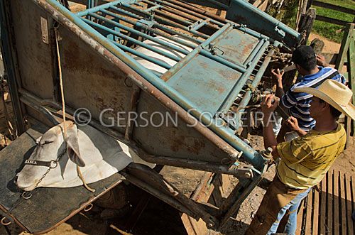 Keywords: Brahman, Gado Pecuaria, Bovino, Animal, Minas Gerais, 2012, Horizontal, Careaçu, Novilha, Casqueamento, Casco, Gente, Homem, Adulto, Casqueador, Equipamento, Brete, Movel |