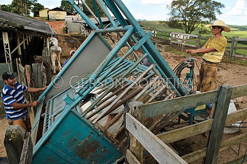 Keywords: Brahman, Gado Pecuaria, Bovino, Animal, Minas Gerais, 2012, Horizontal, Careaçu, Novilha, Casqueamento, Casco, Gente, Homem, Adulto, Casqueador, Equipamento, Brete, Movel |