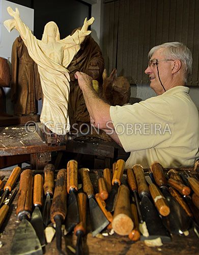 Keywords: Gente, 2012, Santa Catarina, Treze Tilias, Cultura, Arte, Escultura, Madeira, Sacra, Homem, Adulto, Escultor, Esculpindo, Cristo, Vertical |