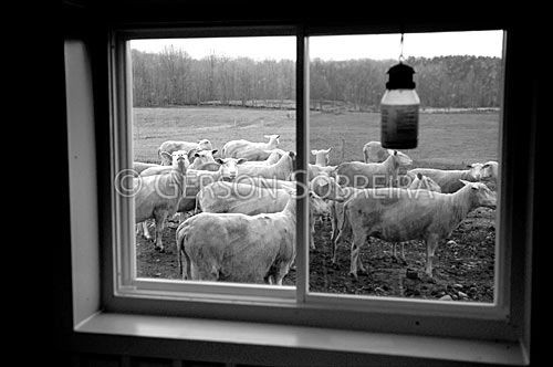 Keywords: Window, Sheep, Ewe, Ovine, Animal, East Friesian, Wool Drift Farm, Shed, Rural installation, Farm, Horizontal, 2005, Black and white, Markdale, Ontario, Canada |