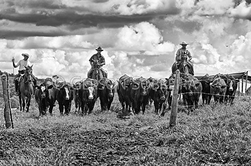 Keywords: Preto e Branco, Vaqueiro Peao Cowboy, Conduçao, Conduzindo, Tocando, Turvolandia, Minas Gerais, 2012, Animal, Gado Pecuaria, Bovino, Horizontal, Cruzamento, 1/2, Meio-sangue Meio sangue, Simental-Angus, Simangus, Tourinho, Touro, Macho, Tourama |