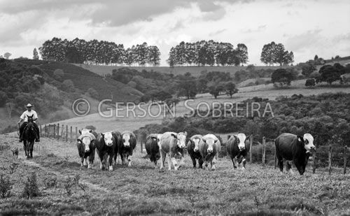 Keywords: Horizontal, Simmental, Bull, Male, Cattle Livestock, Animal, 2009, Turvolandia, Minas Gerais, Drive, Driving, Roundup, Cowpoke Buckaroo Cowboy, Bull group, Black and white |