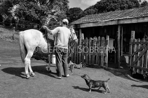 Keywords: Horizontal, Preto e Branco, Cao, Agricultor, Cavalo, Encilhando, Selando, Faxinal dos Kruger, 2014, Parana, Boa Ventura de Sao Roque , Habitaçao Moradia, Casa, Madeira |