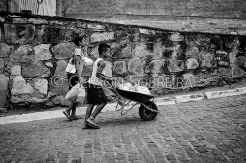 2014, Black and white, Bahia, Lençois, Horizontal, Street, Fair, Boy, Woman, Wheelbarrow, Infantile Work