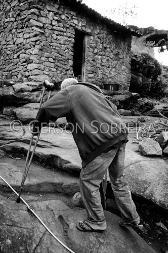 Keywords: 2014, Preto e Branco, Invalido, Garimpeiro, Casa de Pedra, Bahia, Mucuge, Homem, Idoso, Vertical, Muletas |