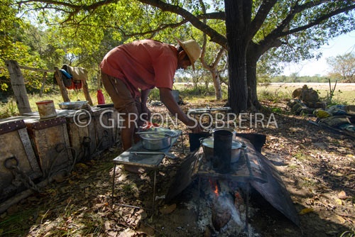 Keywords: 2016, Boiadeiro, Vaqueiro Peao Cowboy, Horizontal, Rio Verde, Pantanal, Mato Grosso do Sul, Comitiva Pantaneira, Pantaneiro, Cozinha, Cozinheiro, Comida, Trempe, Fogao a lenha, Cozinhando, Broaca |