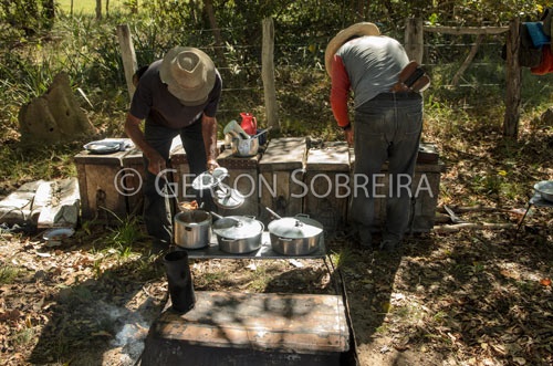 Keywords: 2016, Almoço, Boiadeiro, Vaqueiro Peao Cowboy, Horizontal, Rio Verde, Pantanal, Mato Grosso do Sul, Comitiva Pantaneira, Pantaneiro, Cozinha, Comida, Trempe, Fogao a lenha, Broaca, Panela |