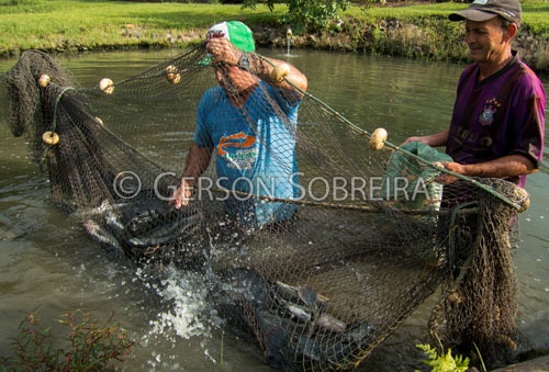 Captura com rede de tilápias em tanque