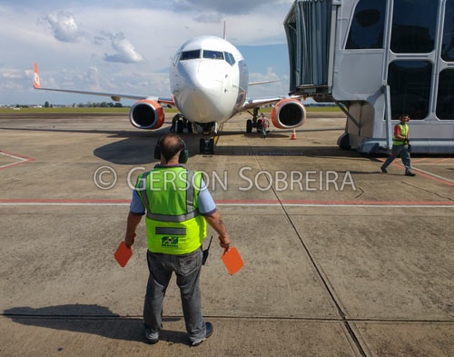 Keywords: Londrina, Aereo, Transporte, Aeroporto, Urbano, Horizontal, Parana, 2016, Aviao, Aeronave, Sinalizador, Homem, Taxiando |