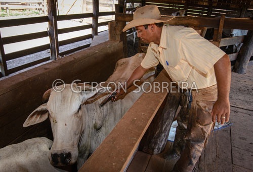 Keywords: Parana, Nelore, Santa Fe, 2017, Gado Pecuaria, Bovino, Vaca, Femea, Vaqueiro Peao Cowboy, Curral, Vacina, Vacinaçao, Pistola, Horizontal |