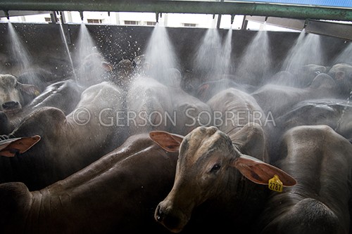 Keywords: Horizontal, Shower, Bath, Cattle Livestock, Bovine, Slaughterhouse, Industry, Belen, Paraguay, 2017, Nelore |