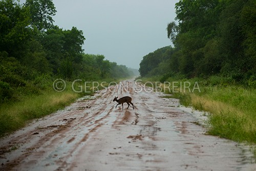 Keywords: 2018, South American Brown Brocket, Mazama gouazoubira, Fauna, Paraguay, Horizontal, Road, Rain |
