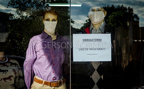 Keywords: 2020, Covid-19, Pandemia, Correaria, Comercio, Alegrete, Rio Grande do Sul, Horizontal, Selaria, Vitrine, Manequim, Mascara, Cartaz |