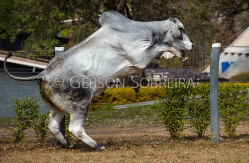 Título: Touro Nelore saltando cerca |