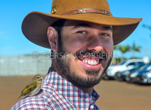 Keywords: Horizontal, 2022, Botucatu, Sao Paulo, Fauna, Bird, Passerine, Native canary, Sicalis flaveola, Man, Smile, Smiling |