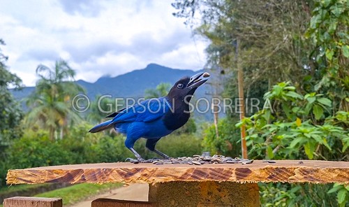 Keywords: Horizontal, Pico do Marumbi, Parana, 2025, Fauna, Morretes, Ave, Passaro, Gralha-azul Gralha azul, Cyanocorax caeruleus, Monstera adansonii, Comendo, Semente |