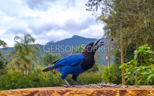 Keywords: Horizontal, Pico do Marumbi, Parana, 2025, Fauna, Morretes, Ave, Passaro, Gralha-azul Gralha azul, Cyanocorax caeruleus, Monstera adansonii, Comendo, Semente |
