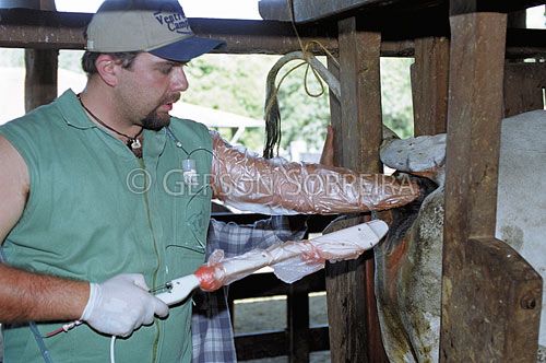 Keywords: Animal, IVF Vitro fertilization, Veterinarian, Job, Man, Adult, People, Embryo, Reproduction, Handling, Cow, Cattle Livestock, Bovine, Ultrasound, Squeeze chute, Ubirajara, Sao Paulo  |