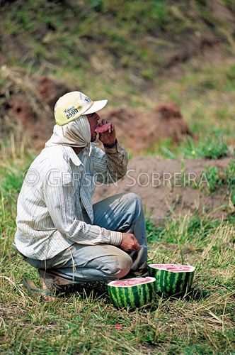 Keywords: Agricultura Agricola, Comendo, Comida, Sentado, Descansando, Repouso, Trabalhador rural, Trabalho, Fruticultura, Fruto Fruta, Melancia, Gente, Homem, Adulto, Oscar Bressane, Sao Paulo |