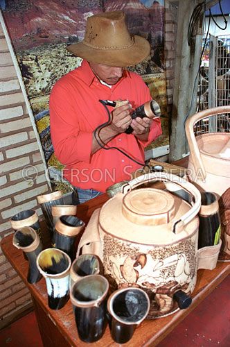 Keywords: Artesanato, Mato Grosso do Sul, Comercio, Venda, Rua, Objeto, Utensilio, Guampa terere, Apetrecho, Couro, Jarra, Cultura, Osso, Gente, Homem, Adulto, Trabalho, Artesao, Pirografo, Campo Grande |