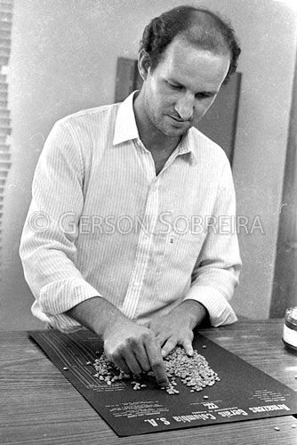 Keywords: Vertical, Provador, Degustaçao, Mesa, Preto e Branco, Branco, Preto, Gente, Londrina, Parana, Homem, Adulto, Classificador, Classificaçao, Industria, Cafe, Trabalho, Agricultura Agricola, Grao, Torrado |