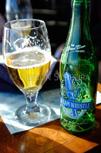 Keywords: Back light Backlight, Clear, Beer, Drink, Aliment, Feeding, Glass, Goblet, Utensil, Bottle, Object, Steam Whistle Beer, Toronto, Ontario, Canada, 2004 |