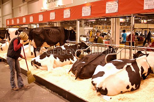 Keywords: Horizontal, Canada, Ontario, Toronto, Royal Winter Fair 2004, Event, Show, People, Woman, Animal, Cattle Livestock, Bovine, Cow, Holstein Friesian, Holstein Friesian, Sweeping, Semex, Booth, Lay down, Bed |