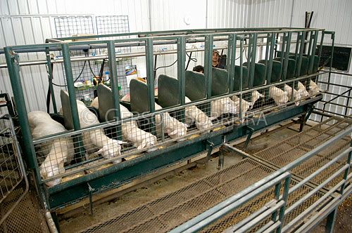 Keywords: Animal, Markdale, Ontario, Canada, Wool Drift Farm, Ovine, Sheep, Ewe, East Friesian, Milkman, Horizontal, Handling, To milk, Mechanical, Squeeze chute, 2005  |